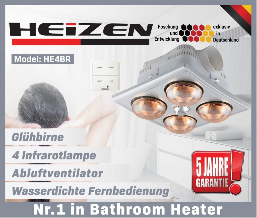 Đèn sưởi Heizen HE‑4BR là thiết bị sưởi ấm cao cấp, kết hợp 4 bóng hồng ngoại, quạt thông gió và đèn chiếu sáng, được điều khiển từ xa. Thiết kế âm trần hiện đại, vật liệu cao cấp và nhiều chức năng giúp HE‑4BR trở thành lựa chọn lý tưởng cho phòng tắm, đặc biệt là những không gian vừa và lớn.