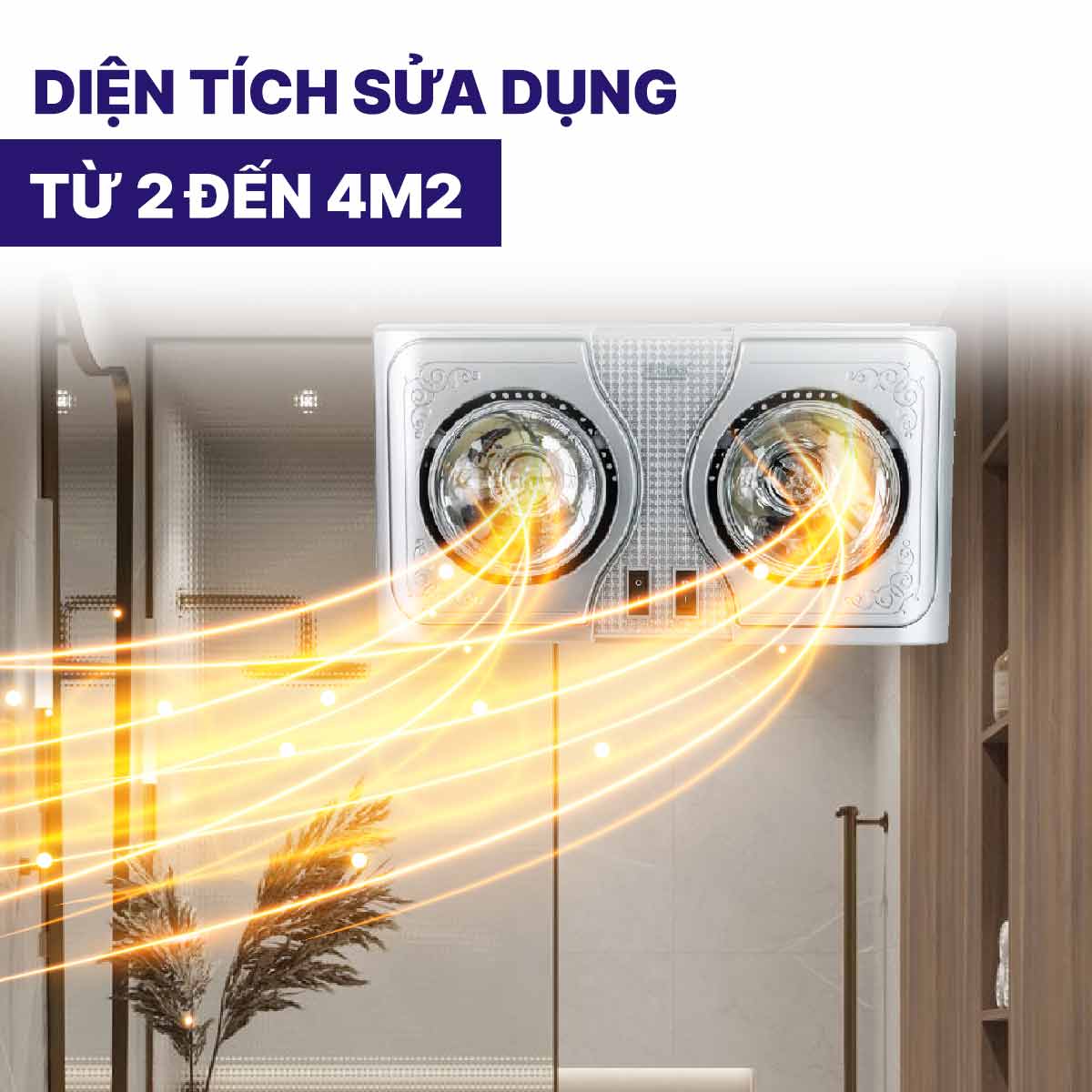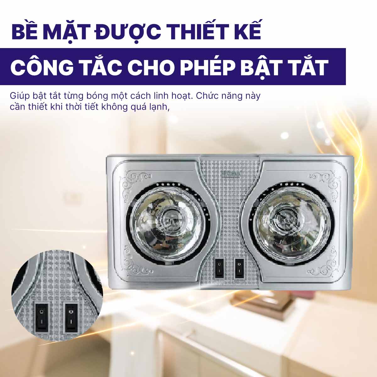 Đèn sưởi Hans 2 bóng H2B được thiết kế tiết kiệm điện, giúp bạn làm ấm phòng tắm hiệu quả mà không lo về hóa đơn điện.