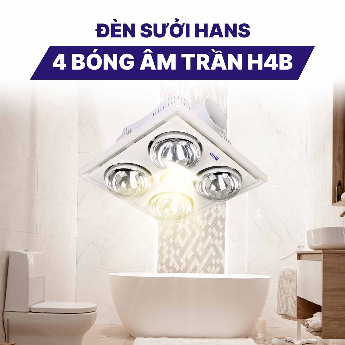 Đèn sưởi Hans 4 bóng âm trần H4B được trang bị 4 bóng đèn halogen chất lượng cao, với tổng công suất lên đến 2000W (500W mỗi bóng), giúp làm ấm nhanh chóng và hiệu quả cho không gian phòng tắm từ 6-10m².