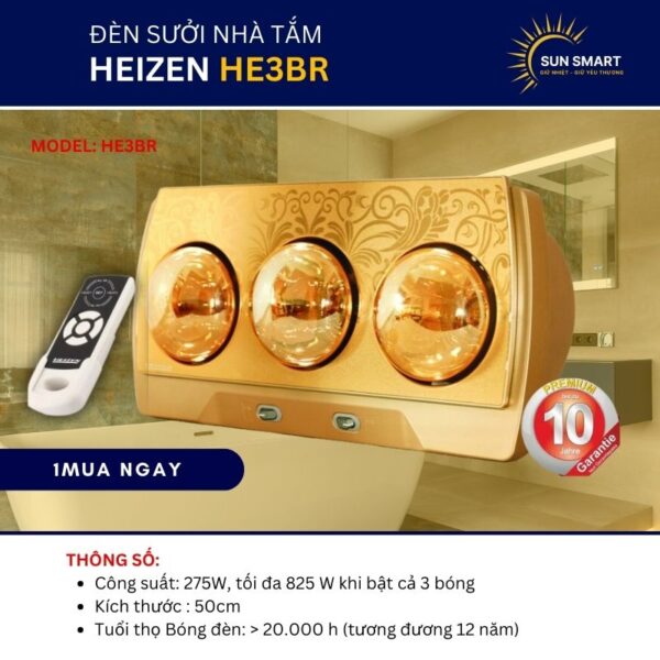 Đèn sưởi Heizen HE3BR là thiết bị sưởi ấm cao cấp, thiết kế treo tường với ba bóng hồng ngoại vàng, điều khiển từ xa và thân đèn bằng hợp kim nhôm hoa văn cổ điển. Đây là lựa chọn lý tưởng cho các gia đình cần một giải pháp sưởi ấm hiệu quả, an toàn và tiện dụng trong phòng tắm.