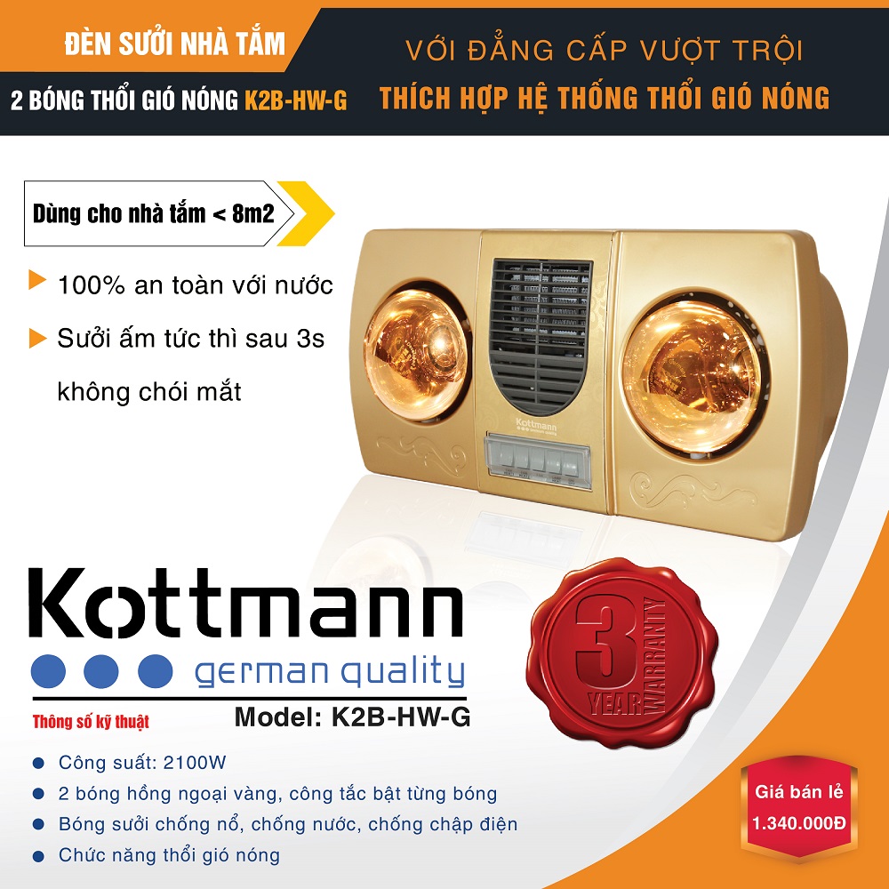Đèn sưởi Kottmann K2B‑HW‑G là mẫu đèn sưởi cao cấp, thiết kế treo tường, tích hợp hai bóng hồng ngoại và quạt gió thổi nóng. Sản phẩm mang lại khả năng làm ấm nhanh, luồng khí ấm lan tỏa đều, an toàn cho người dùng và phù hợp với nhiều diện tích phòng tắm.