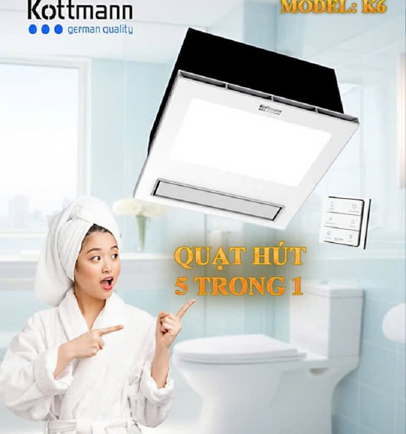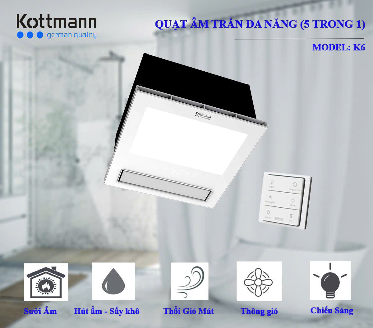 Quạt âm trần Kottmann K6 là thiết bị đa năng, tích hợp 5 chức năng trong một sản phẩm duy nhất: sưởi ấm, sấy khô, làm mát bằng quạt gió, thông gió/hút mùi và chiếu sáng LED. Đây là giải pháp toàn diện, lý tưởng cho phòng tắm hoặc không gian nhỏ, giúp sử dụng hiệu quả quanh năm mà vẫn giữ vẻ hiện đại, sang trọng.